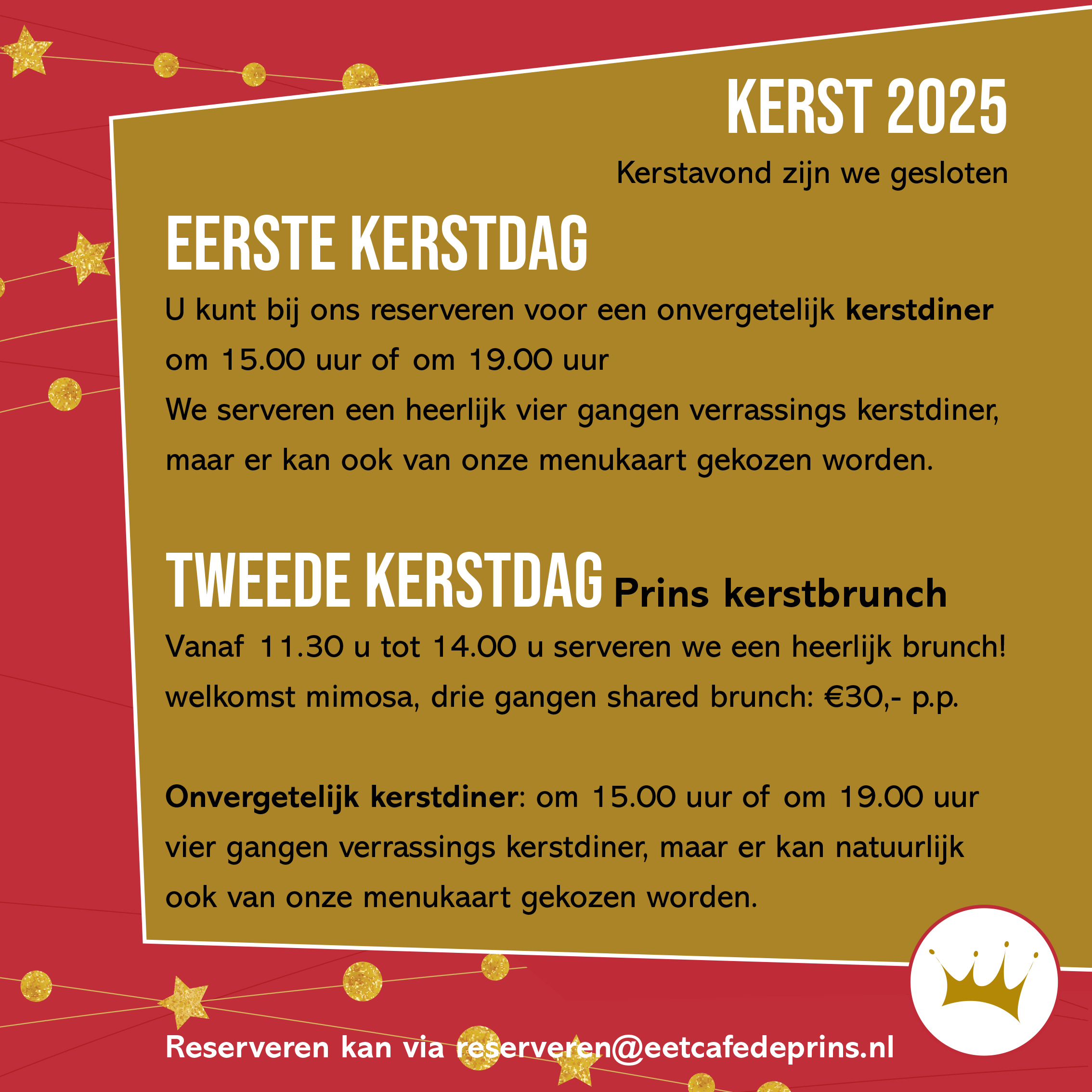 Van vier-gangen verrassings kerstdiner, kerstbrunch tot toch gewoon lekker zelf kiezen van de menukaart. Alle informatie vind je in de afbeelding.