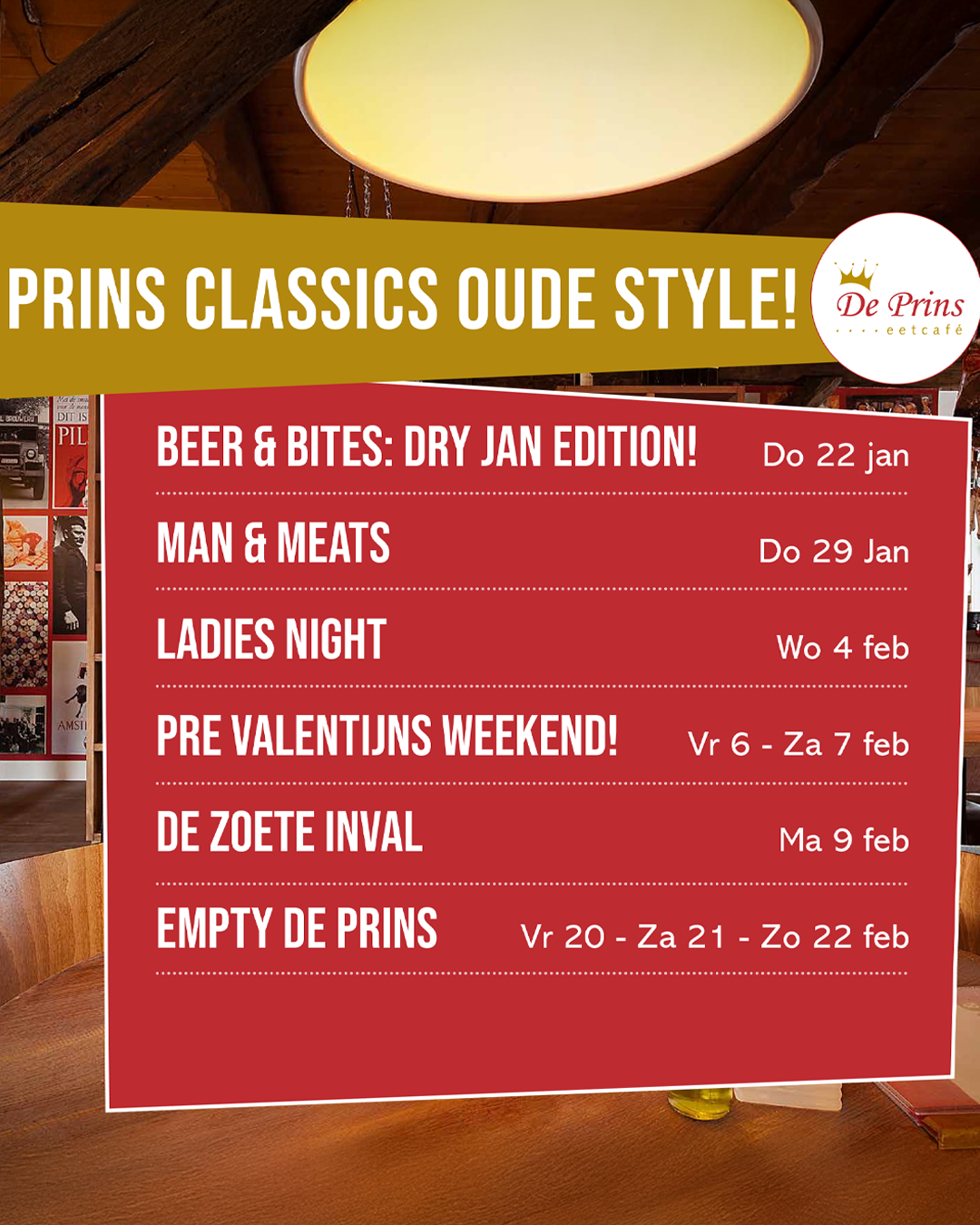HET populairste thema van de Prins: Ladies Night! De vorige editie had nog niet plaats gevonden of er werd al gevraagd wanneer de volgende editie zou zijn. 4 gangen shared dining en een welkomstcocktail mag daar uiteraard niet bij ontbreken. Trommel je vriendinnen op en reserveer snel, want VOL = VOL!