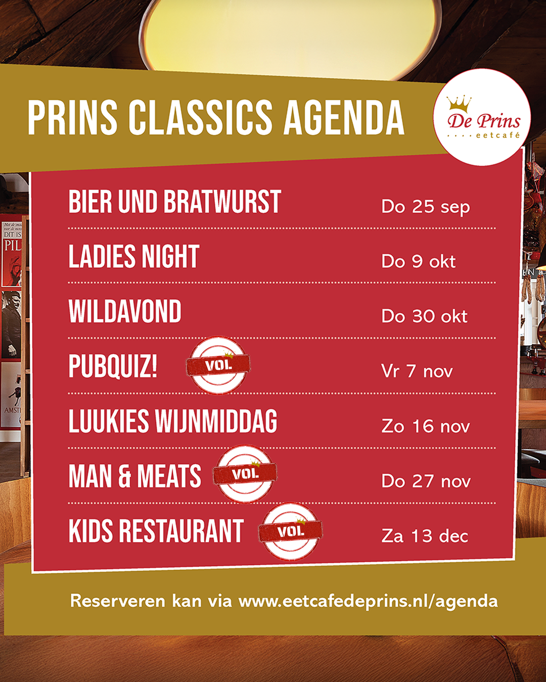 Hét populairste thema van de Prins, de Ladies Night! De vorige editie had nog niet plaats gevonden of er werd al gevraagd wanneer de volgende editie zou zijn. 4 gangen shared dining voor €40,- p.p. en een welkomstcocktail mag daar uiteraard niet bij ontbreken. Trommel je vriendinnen op en reserveer snel, want de volgende Ladies Night zal pas weer in 2026 zijn.